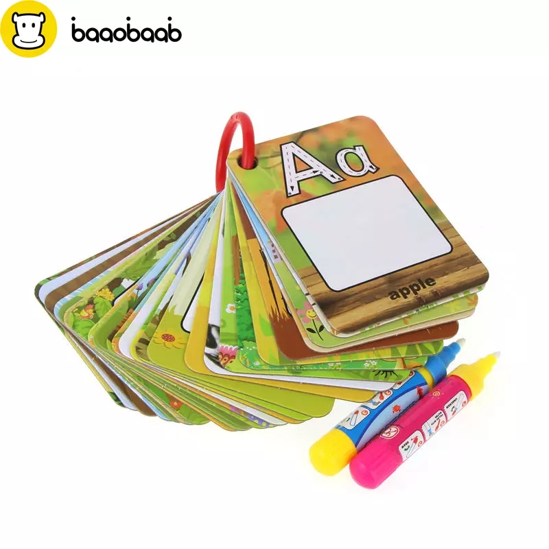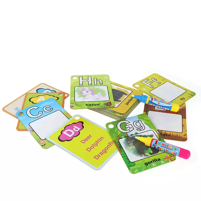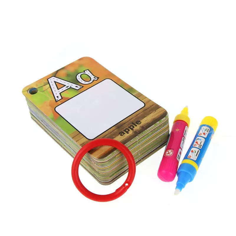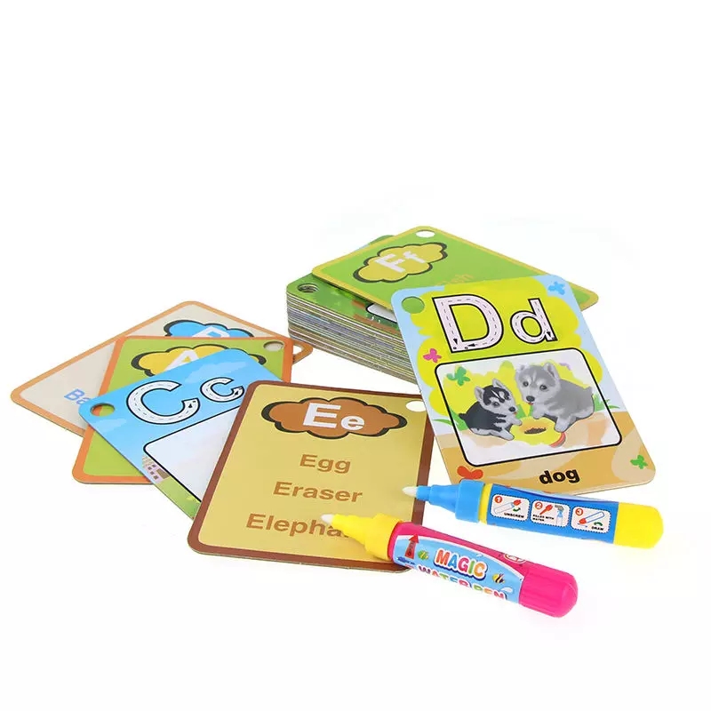 يتم ملء القلم بالماء ويلون فوق الكارت حتى تظهر الصورة تدريجيا بطريقة ممتعة وساحرة وبعد أن تجف البطاقة تختفي الصورة من جديد يساعد الطفل على مسك القلم بشكل صحيح، مرحلة تمهيدية للتلوين والتخطيط