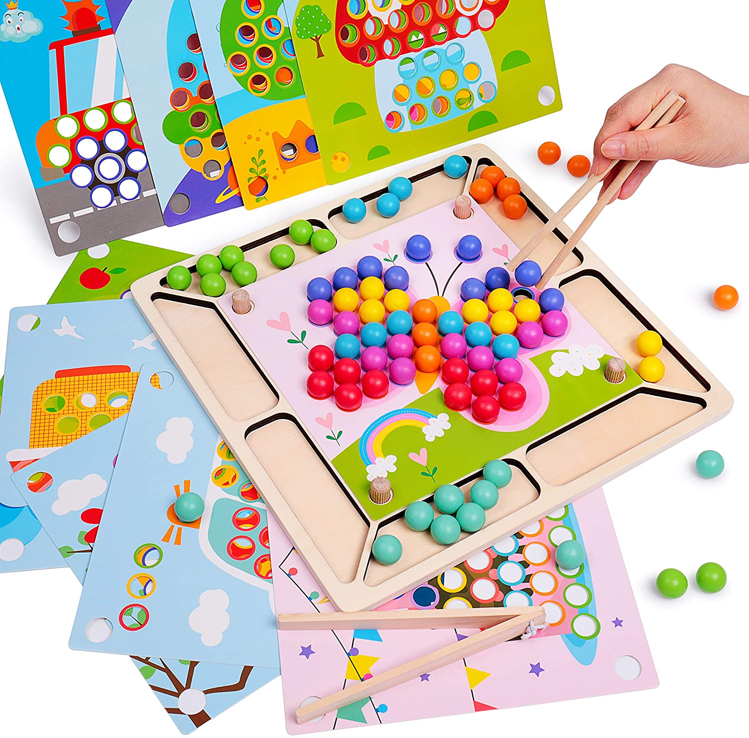 يمكنه ممارسة التنسيق بين يد الطفل ، والتعرف على الألوان ، وممارسة استخدام عيدان الطعام ، والترفيه والتعليم ، وإعطاء الأطفال الخيال للعب.