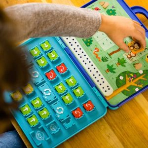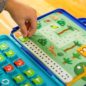 - Le but de ce jeu ? Guider le singe sur le chemin le plus court jusqu’aux bananes à l’aide des jetons (flèches et boucles).